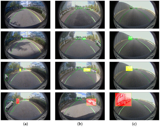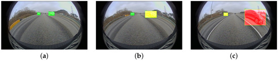 Figure 18 shows the results of the collision warning system. As shown in Figure 18, collision warnings are activated when an object is approached. In Figure 18, green represents a Level 1 collision warning, yellow represents Level 2, and red represents Level 3. Figure 18a shows the collision warning for a motorcycle in an urban setting, Figure 18b shows the warning for a car on an urban road, and Figure 18c shows the collision warning for a truck on a highway.