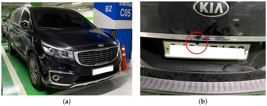An experimental setup was established for this study. A camera was mounted on the test vehicle, a Kia Carnival, to capture the image data. The camera, installed at the rear of the vehicle, features a 185° fisheye lens with an image resolution of 1280 × 720 pixels. The experiment was conducted on an Intel NUC 11 Enthusiast equipped with an Intel i7-1165G7 processor, an NVIDIA GeForce RTX 2060 graphics card, and 32GB of RAM. Figure 13 illustrates the test vehicle equipped with a rearview camera.