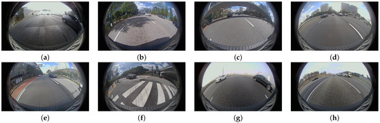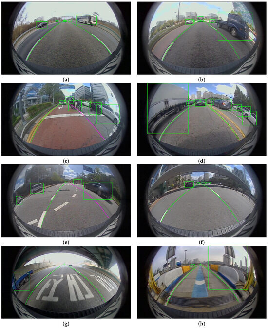 The datasets were collected from diverse environments, as illustrated in Figure 14, which presents an overview of the acquisition conditions across different settings. The data were collected on urban roads and highways, encompassing a variety of vehicle types. Additionally, data from under bridges were obtained to account for lighting changes. The dataset also includes scenarios with a high number of objects on urban roads and highways. Figure 14a illustrates the situation under a bridge on a highway, showing changes in lighting. Figure 14b depicts the shadow caused by side trees on an urban road. Figure 14c shows the area under a bridge on an urban road. Figure 14d presents a situation with many vehicles on an urban road. Figure 14e depicts a case where the lane is colored red. Figure 14f shows a situation with a crosswalk during a right turn at an intersection. Figure 14g illustrates a typical highway scenario, and Figure 14h shows a situation with many vehicles on a highway.