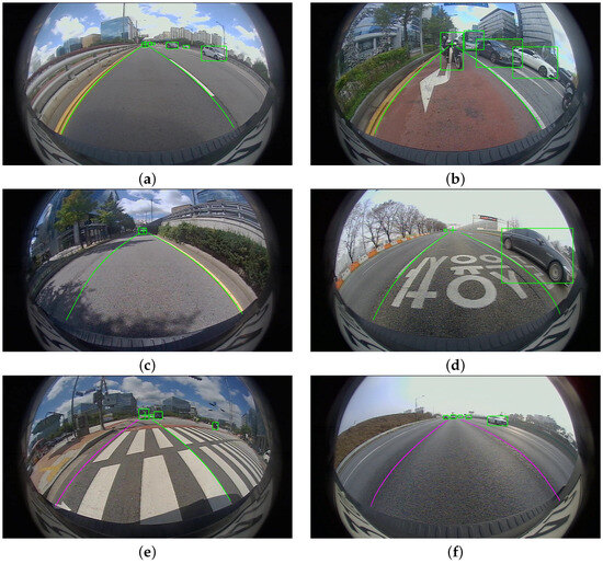 Figure 16 illustrates the lane detection cases for various scenarios. Figure 16a depicts multi-yellow lane markings, Figure 16b presents a red lane, Figure 16c shows the presence of shadows, and Figure 16d highlights the center letters. Figure 16e,f illustrate cases of undetected and misdetected lane markings. In Figure 16e, a crosswalk is mistakenly detected as a lane marking, whereas Figure 16f shows the result where lane detection is not performed due to blurred lane markings and light reflection caused by backlighting.