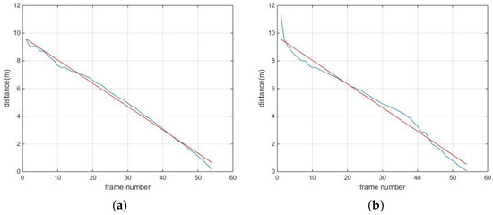 Figure 17 shows a comparison of the relative distance extraction results with and without the use of vanishing points. Figure 17a presents the distance calculations without a vanishing point, where the blue line indicates the extracted distance value and the red line represents the one-dimensional fit. Figure 17b shows the distance calculations using a vanishing point, where the blue line represents the extracted distance and the red line indicates the one-dimensional fit.