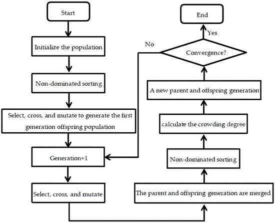 The fundamental concept of the genetic algorithm approach is illustrated in Figure 4. Firstly, a random initial population composed of multiple individuals is generated. Through non-dominated sorting, the likelihood of selecting individuals with higher fitness is significantly greater than that of selecting individuals with lower fitness. Subsequently, the first-generation offspring population is produced through crossover and mutation. Starting from the second generation, the parent population and the offspring population are combined, and non-dominated sorting is employed to calculate the crowding degree of the individuals, with suitable individuals being selected to generate the new parent population. Ultimately, through the continuous repetition of the aforementioned selection, crossover, and mutation processes, the population gradually evolves, and the fitness is constantly enhanced, eventually converging to an optimal or near-optimal solution.