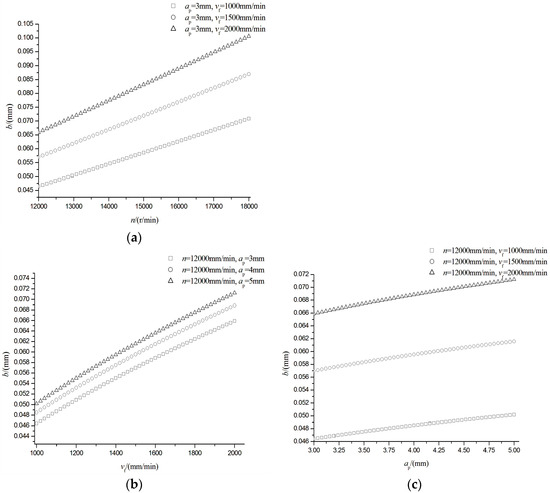 The variation relationship between the wear width, b, of the rake face and the spindle speed, n, the feed rate, vf, as well as the axial milling depth, ap. (a) The b-n variation curve; (b) the b-vf variation curve; (c) the b-ap variation curve.