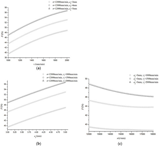 The variation relationship between the milling force, F, and the spindle speed, n, the feed rate, vf, as well as the axial milling depth, ap. (a) The F-vf variation curve; (b) the F-ap variation curve; (c) the F-n variation curve.