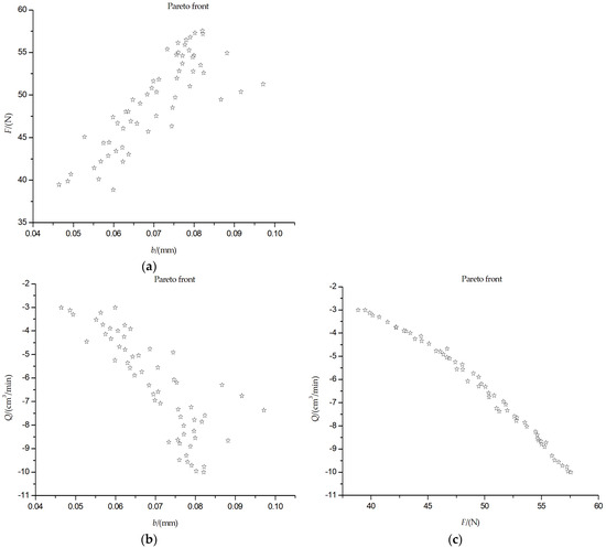 The Pareto frontier of the objective function. (a) F-b Pareto front distribution; (b) Q-b Pareto front distribution; (c) Q-F Pareto front distribution.