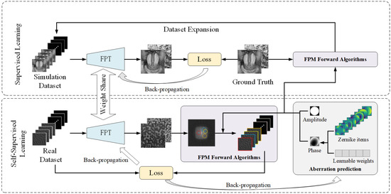 To address the optical aberration issues encountered by the neural network in practical optical imaging systems, we employ a semi-supervised learning framework. This framework is structured into two stages—self-supervised training and supervised training—as illustrated in Figure 1. For self-supervised learning, we employed a Zernike model with learnable weights to reconstruct the pupil aberration. The first fifteen Zernike terms were weighted by their corresponding learnable coefficients, summed to construct the pupil aberration, and incorporated into the downsampling step of the FPM forward process. With this learnable pupil function, the generated low-resolution amplitude sequences were compared with the input to calculate the loss and update both the network parameters and the aberration weights. After a predefined number of training epochs, the training transitioned to the second stage (the supervised training) during which the pupil aberration weights were fixed, and simulated datasets were created using the pupil function for data augmentation. The remaining training epochs are completed using supervised learning to further enhance the neural network performance and improve the overall imaging quality.
