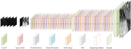 In each transformer block, is first converted into a window patch sequence via the image to patch module, which is inspired by the shifted windows in the Swin transformer [37], where H represents the window patch size. This module alternates pixel assignments into patches, ensuring that the deep network captures long-range spatial dependencies. Then, feature extraction is conducted along two dimensions: the pixel self-attention module calculates the self-attention relationship among pixels within each spatial patch, focusing on capturing spatial-level detail features, expressed as follows:
