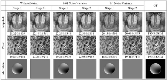 To validate the efficacy of the proposed method, we conducted simulations comparing the two-stage reconstruction performance of the network under varying intensities of noise and optical aberrations. Gaussian-distributed noise with a mean of zero and variances of 0.10, 0.05, and 0.01 was introduced. The comparative results are illustrated in Figure 3. As shown in Figure 3, it is evident that even in the presence of noise effects of different intensities, the first stage of the network effectively reconstructs the pupil function with aberrations, while the supervised learning in the second stage significantly enhances the reconstruction outcomes in terms of SSIM and PSNR.