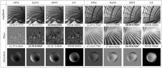 Further comparative analysis of simulated dataset reconstructions using various methods is presented in Figure 4, where we conducted comparative experiments between the traditional FPM algorithm, the deep learning-based FuNN [26], and SFPT. As shown in Figure 4, our method attains superior performance in PSNR and SSIM metrics for amplitude and phase reconstruction, exhibiting noticeably reduced visual artifacts.