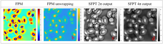 To further validate the model’s performance on in a real experimental environment, we captured images of bullfrog erythrocytes, approximately 16–25 m thick [40], and the phase range was calculated to be approximately 2 to 4 in water. We compared the reconstructed phase of traditional FPM with the reconstructed phase obtained by SFPT trained on different phase range datasets; the reconstruction results are shown in Figure 8: