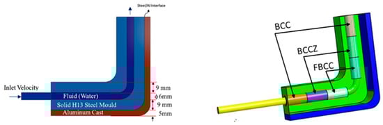 Three different lattice structure sleeves surrounding the cooling pipe were generated and modelled as solid regions with the equivalent physical and thermal properties of three lattice structures: Body-Centred Cubic Cell (BCC), Face-and-Body-Centred Cubic Cell with Z-axis struts (BCCZ), and Face-Centred Cubic Cell with Z-axis struts (FBCC) []. Figure 1 illustrates the general layout and schematic of the corner cooling channel, where the cast is positioned at the external side of the mould corner with a single cooling channel passing through the mould cavity. The mould block dimension is 80 × 80 mm with a depth of 18 mm. The cooling channel diameter is 6 mm, and the pitch distance between the bottom surface of the pipe and the mould/cast interface is maintained at 9 mm.