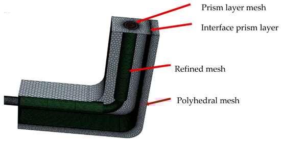 A polyhedral mesh with near-wall prism layers was employed to accurately capture the boundary layer near the walls for accurate evaluation of heat flux at the interface and cooling pipe surface. Various mesh sizes were used within the domain, with finer mesh regions applied to the fluid flow area and near the interface walls, as shown in Figure 2. The control volume method implemented in the STAR-CCM+ CFD package was used to discretise the governing equations. A mesh convergence study was performed to ensure that the results were independent of mesh resolution. The simulation employed a total cell count of approximately 450,000, with an overall mesh quality of 98.71%, based on evaluations of mesh validity and skewness angle. To address the near-wall viscous transitional sublayer, the all Y+ wall treatment model was used, accommodating different boundary layer mesh densities.