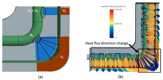 To understand the heat transfer process from the cast part (assumed to be the heat generation source) to the cooling pipes, a schematic diagram and heat flux streamlines are presented in Figure 3. Figure 4a illustrates that the volume of the cast at the corner, V1, is in contact with a limited area on the pipe, A1, when heat is transferred perpendicularly to the interface. On the corner’s sides, the same area, A2 = A1, is available to transfer only a fraction of the heat generated by V2. This constrained area for heat transfer to the pipe results in high thermal resistance along the perpendicular path.