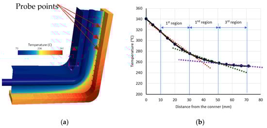 Baseline temperature distribution: (a) contours of temperature at the cast/mould interface, pipe surface, and a central section. (b) temperature at different probe points starting from the part corner.