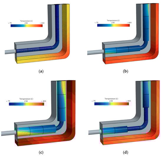 Temperature distribution in the cast, interface, lattice structure, and pipe surfaces. (a) Baseline cooling—no lattice structure; (b) cooling pipe with 1.5 mm lattice structure; (c) cooling pipes with 3 mm lattice structure; (d) two 1.5 mm lattice structures.