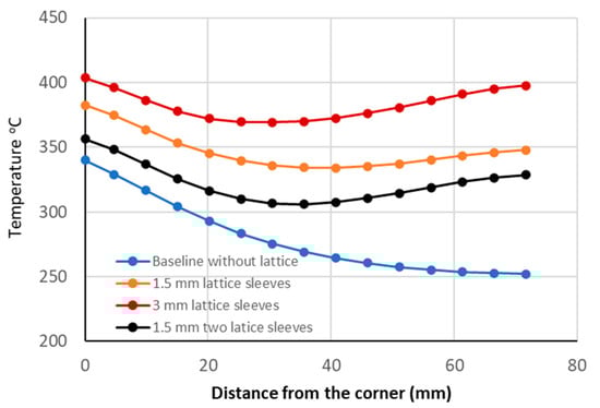 To further assess the impact of lattice structure sleeves on corner temperature, the temperature variation along the side of the corner was evaluated using the probe points shown earlier in Figure 4. As illustrated in Figure 6, all three cases exhibit reduced temperature variation; however, the corner temperature increases as the thermal resistance imposed by the lattice structure increases. Specifically, the corner temperature rises from 340 °C to 370 °C and 400 °C for the 1.5 mm and 3 mm sleeves, respectively. By removing the closest lattice structure to the corner while retaining the others and using 1.5 mm sleeves, the corner temperature increases to 356 °C, which is still slightly higher than the corner temperature without the sleeves (16 °C difference). Nevertheless, this configuration results in more uniform cooling distribution across the cast part, with a small rise in corner temperature. The difference between the maximum and minimum temperatures decreases from 88 °C in the baseline case to 50 °C along the selected probe points, representing approximately a 42% improvement in temperature uniformity.