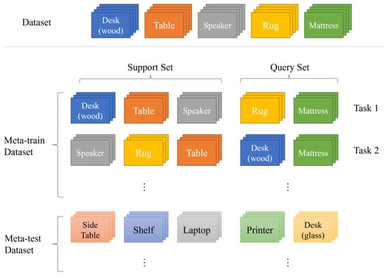 Humans can learn from just a few examples, whereas deep learning models typically require hundreds of data points for effective training [22]. The concept of enabling deep learning models to learn new concepts like humans is called meta-learning, and learning with minimal examples is referred to as few-shot learning [23,24,25,26,27,28]. Few-shot learning aims to train classifiers to recognize new classes with only a small number of examples. When training involves K data points for N classes, the process is described as N-way K-shot learning. Figure 1 illustrates the three-way three-shot learning method in few-shot learning. Few-shot learning operates in task units, consisting of a support set and a query set, to achieve meta-learning. The dataset used for training is called the meta-training set, while the dataset used for evaluation is referred to as the meta-test set. For validation, the dataset is known as the meta-validation set. One notable few-shot learning model, Matching Networks, facilitates rapid learning. Deep learning models often require large datasets due to the need for iterative weight updates using Stochastic Gradient Descent (SGD). Matching Networks, however, leverages ideas from non-parametric models, such as K-Nearest Neighbors (KNN), which dynamically adjust to the data instead of predefining parameters. This allows the design of models that achieve excellent generalization performance with limited data. Matching Networks utilizes an attention mechanism to predict unlabeled query sets using embeddings learned from labeled support sets. It also employs mini-batches, called episodes, to achieve superior generalization performance.