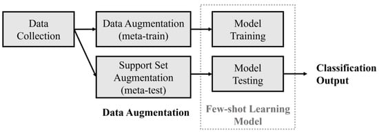 The existing study [6], which utilizes smartphone vibrations and accelerometers for material recognition, is based on a deep learning model to identify the surface in contact with the smartphone. For this, the study required 180 s of accelerometer data per label. Such a lengthy data collection process makes it impractical for users to manually register labels in real-life applications. To enhance usability and reduce the need for extensive training data, the core technologies of FSMR (few-shot learning-based material recognition) are data augmentation [21] and few-shot learning. This section introduces the concept of few-shot learning.
