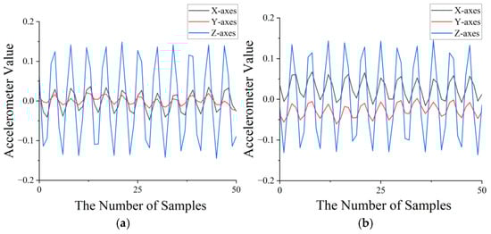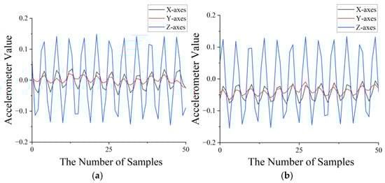 Accelerometer data collected with a smartphone placed on a blanket. (a) Original data. (b) Augmented data by applying scaling to the original data.
