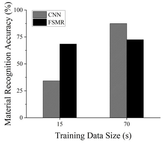 Material recognition accuracy of CNN and FSMR trained by 2 datasets that have different sizes.