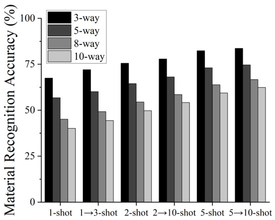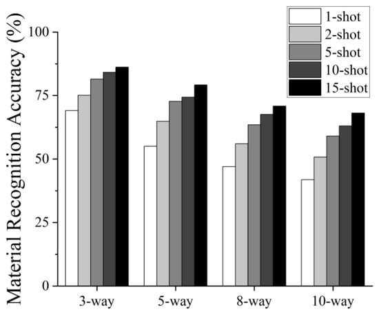 Material recognition accuracy of FSMR using different N-way K-shot configurations.