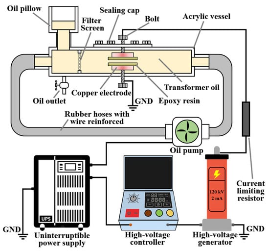 Before the experiment, carbon particle samples, epoxy resin boards, and transformer oil were placed in a vacuum drying oven and treated at 80 °C and 50 Pa for 48 h to meet the insulation oil standards of the CIGRE working group [,]. Subsequently, the carbon particles were mixed with transformer oil to form a suspension of 0.02 g/L and sealed for later use. Before each pour into the container, the suspension was evenly mixed using a magnetic stirrer. The electrode surface was covered with an epoxy resin board and fixed inside the container with bolts. The bolts were then adjusted to keep the distance between the epoxy resin boards at 4 mm. Then, the insulation oil suspension was poured into the container until the liquid level in the oil pillow was above the top of the container.