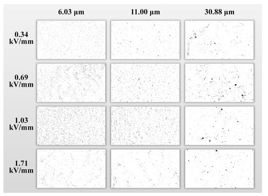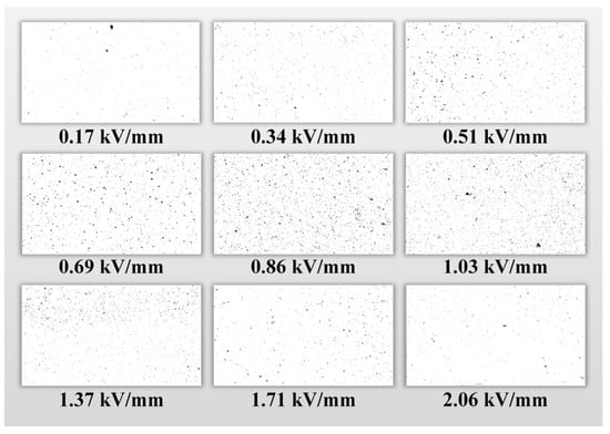 Due to the fact that electric field force is the main driving force for particle movement in oil, the strength of the electric field will affect the adhesion degree of carbon particles on the surface of epoxy resin. To study the influence of electric field strength on the degree of particle adhesion, this paper conducted carbon particle adhesion experiments under different electric field strengths. Carbon particles with a median particle size of 11.00 μm were taken as samples, and the control of electric field strength was achieved by changing the output voltage of the DC high-voltage generator. The corresponding carbon particle adhesion images are shown in Figure 8, and the calculated average proportion of adhesive area of each group of experiments is shown in Figure 9.