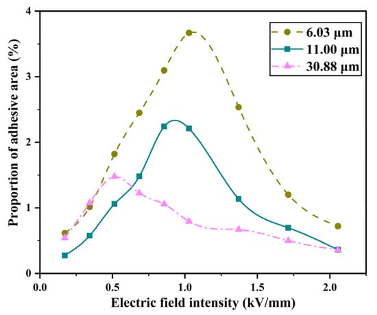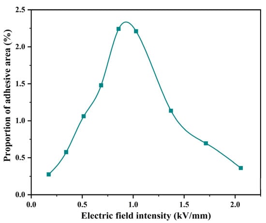 The data in Figure 9 indicates that the magnitude of the electric field strength can have a significant impact on the adhesion degree. When the electric field strength is low, the proportion of carbon particle adhesion area is also low, with only 0.27% of the particle adhesion area under an electric field of 0.17 kV/mm; as the electric field strength increases, the proportion of carbon particle adhesion area also increases. When the electric field strength increases to 0.86 kV/mm, the proportion of carbon particle adhesion area reaches its maximum, reaching 2.24%; as the electric field strength further increases, the proportion of carbon particle adhesion area no longer increases, but shows a decreasing trend. When the electric field reaches 2.06 kV/mm, the proportion of particle adhesion area decreases to 0.36%. Therefore, the adhesion degree of carbon particles increases first and then decreases with the increase in electric field strength; that is, there exists a specific field strength that causes the adhesion degree of carbon particles to reach peak value. This field strength is referred to as the peak adhesion field strength in this article.