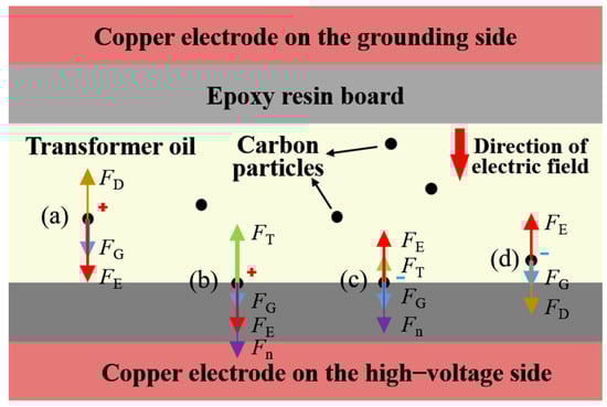 where is the vertical velocity of particles in the transformer oil, n is the total number of particles in the transformer oil between the electrode plates, and d is the spacing between epoxy resin boards. Neglecting the acceleration process of adhesive particles in oil after being pulled apart by electric field force, the charge of particles in oil remains basically unchanged during their movement, and their electric field force and drag force will reach an equilibrium state, as shown in Equation (11). At this time, the particles maintain uniform motion along the direction of the electric field.