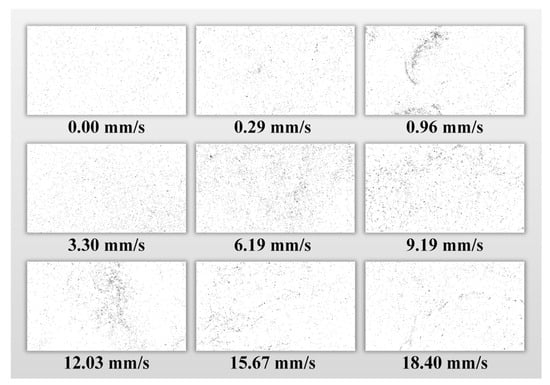 According to the analysis in Section 2.3, although the forced oil circulation inside the rising seat is relatively small due to the commutation flow, the internal insulation oil is not absolutely stationary, but there is thermal convection. Therefore, the influence of insulation oil flow velocity on particle adhesion characteristics needs to be considered. To this end, this paper simulates the oil flow inside the converter flow rising seat through an insulation oil circulation system and conducts adhesion experiments of carbon particles under different insulation oil flow rates. The applied DC voltage is kept constant at 10 kV, and the corresponding carbon particle adhesion images are shown in Figure 13. The average adhesion area ratio of each group of experiments is calculated as shown in Figure 14.