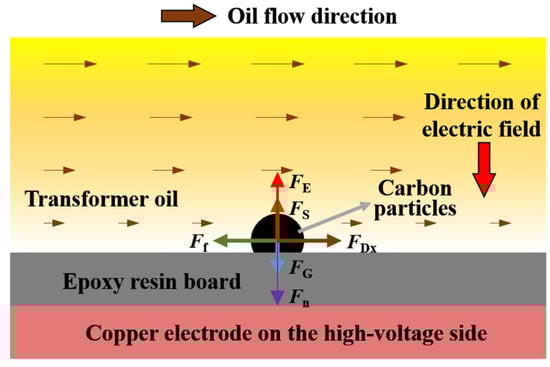 Schematic diagram of the forces on carbon particles under the action of flowing transformer oil.