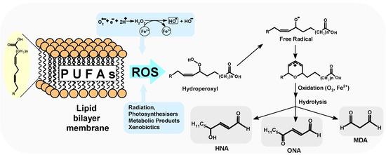 A schematic representation of lipid peroxidation product formation as a result of the activity of various harmful factors. PUFAs—polyunsaturated fatty acids, ROS—reactive oxygen species, HNA—4-hydroxy-2-nonenal, ONE—4-oxo-2-nonenal, MDA—malondialdehyde. It should be pointed out that the above levels vary according to age and health.