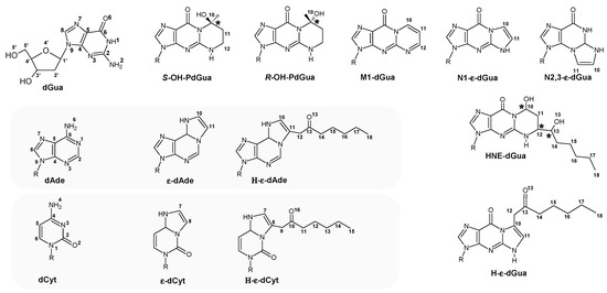 A graphical representation of the investigated nucleoside adducts with atoms numbered and chiral centres indicated (*). R: 2-deoxyribose, dGua: 2′-deoxyguanosine, dAde: 2′-deoxyadenosine, dCyt: 2′deoxycytidine, ε-dCyt: 3,N4-etheno-2′-deoxycytidine, ε-dAde: 1N6-etheno-2′-deoxyadenosine, N1-ε-dGua: 1,N2-etheno-2′-deoxyguanosine, N2,3-ε-dGua: 2,N3-etheno-2′-deoxyguanosine, (R/S) 10-OH-PdGua: (R/S) 10-hydroxy-1,N2-propano-2′-deoxyguanosine, H-ε-dCyt: 8-(10-oxoheptyl)-3,N4-etheno-2′-deoxyctidine, H-ε-dAde: 11-(13-oxoheptyl)-1,N6-etheno-2′-deoxyadenosine, H-ε-dGua: 11-(13-oxoheptyl)-1,N2- etheno-2′-deoxyguanosine, HNE-dGua: 12-(13-hyroxyheptyl)-1,N2-propano-2′-deoxyguanosine, M1-dGua: malondialdehyde-2′-deoxyguanosine or 1,N3-propano-2′-deoxyguanosine.