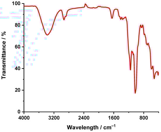 As such, the presence of the main structural characteristics of SBECD were revealed on the FTIR spectrum. The presence of the O–H bonds can be correlated with the broad band seen in the 3700–3050 cm−1 spectral range determined by the stretching vibrations of these bonds. The characteristic stretching vibrations of the methylene groups are revealed at 2932 cm−1 (the asymmetric stretching vibration of the C–H bond) and 2885 cm−1 (the symmetric stretching vibration of the same bond type). A well-defined signal can be seen at 1643 cm−1, its presence being due, according to the literature data, to the bending vibration of the H-O-H bonds belonging to the water molecules intercalated in the structure of SBECD [16,36]. The two low-intensity bands observed at 1411 and 1365 cm−1 may be correlated with the association of the in-plane bending vibration of the O-H bonds with the wagging deformation vibration of the C-H bonds present in the structure of SBECD.