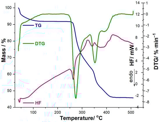 The DTG curve reveals the dehydration process that took place in the 40–137 °C temperature range, followed by another two consecutive processes associated with the decomposition of anhydrous SBECD, namely in the 239–313 °C range (DTGpeak at 273 °C) and in the 313–379 °C range (DTGpeak at 352 °C), followed by another process in the 379–500 °C range (DTGpeak at 394 °C). The HF curve reveals the endothermic water loss—the first process was between 40 and 48 °C (HFpeak at 44 °C)—probably associated with superficial adsorbed water (or so-called surface water) [37,38], and a second water release process between 48 and 137 °C (HFpeak at 67 °C), probably associated with strong bonded water [37]. Another endothermic process takes place in the 248–291 °C range (HFpeak at 274 °C), associated with the melting of SBECD, in good agreement with the literature data that indicate the 266–274 °C interval for this phase transition [39]. It is worth mentioning that such a large interval for melting is due to the amorphous nature of the SBECD sample, as confirmed by the PXRD study.