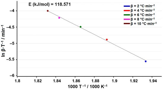 As a preliminary method, we have used the ASTM E698 method, which is a standardized approach used to determine the apparent activation energy (Ea) of chemical reactions [45]. This method is widely used in industries such as pharmaceuticals, polymers, and materials science to study the stability and degradation of substances, but can be used only as a preliminary method before carrying out isoconversional studies, since it is based on the hypothesis that the decomposition process follows a single reaction mechanism throughout the entire reaction, which is a limitation when dealing with complex reactions involving multiple steps or changes in mechanisms over time. As a result, the calculated activation energy (Ea) may not be accurate for reactions that exhibit multi-step or overlapping mechanisms [22,46].
