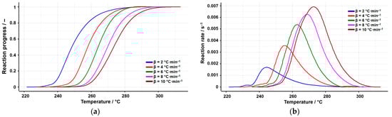 The investigated process corresponds to the first degradation step of anhydrous SBECD, occurring within the following temperature ranges: 221–289 °C (at β = 2 °C·min−1), 228–298 °C (at β = 4 °C·min−1), 235–303 °C (at β = 6 °C·min−1), 238–309 °C (at β = 8 °C·min−1), and 239–313 °C (at β = 10 °C·min−1). As expected, the process shifts to higher temperatures, and the reaction rate increases with higher heating rates, as shown in the plots of the reaction progress vs. temperature (Figure 6a) and reaction rate vs. temperature (Figure 6b). This behavior is attributed to the thermal inertia of the samples during heat transfer at elevated heating rates.