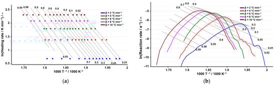 Isoconversional kinetic analysis is a robust tool used to study the degradation behavior of materials, providing a non-mechanistic method for estimating the kinetic parameters of a reaction [28,29,41]. In contrast to model-fitting methods, which rely on predefined reaction mechanisms, isoconversional models determine kinetic parameters solely from the experimental data obtained across various heating rates [29,47].