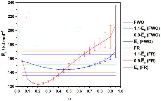 By analyzing the data presented in Table 1 and Figure 8, it can be observed that the data processing by the integral and differential protocols reveals a similar trend regarding the variation of Ea with the advance of the reaction, namely at low conversion degrees (α ≤ 0.2 for FR and α ≤ 0.5 for FWO), and the decrease in Ea was observed, followed by an increasing trend as the conversion increases (α > 0.2 for FR and α > 0.5 for FWO).