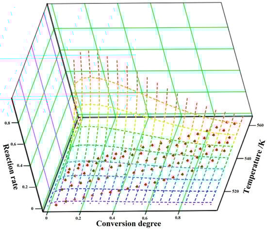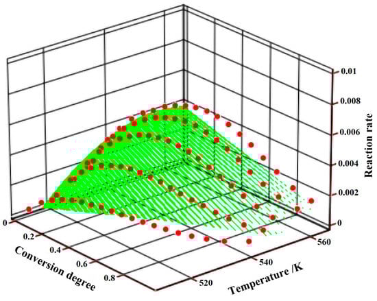 The thermoanalytical data obtained by carrying out experiments at five heating rates led to a family of curves (presented in Figure 9 as red dots) that generated an interpolated 3D surface of the reaction rate (green lines), by multivariate regression.
