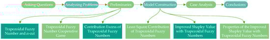 The rest of the paper is organized as follows: Section 2 reviews the related literature; Section 3 introduces the preliminary contents closely related to the study of this paper, including trapezoidal fuzzy numbers and the contribution excess of the players; Section 4 proposes the least square contribution of trapezoidal fuzzy numbers with trapezoidal fuzzy numbers that take into account the contribution excess of the players and further improves the Shapley value with it, also proving the nature of the improved Shapley value; Section 5 verifies the applicability and superiority of the improved Shapley value with trapezoidal fuzzy numbers proposed in this paper through a real case of profit allocation in e-commerce logistics alliance of forest products; Section 6 summarizes the main conclusions and discusses the possible directions of future research. Figure 1 shows the research flowchart of this study.