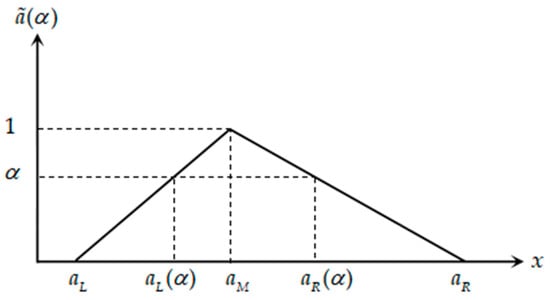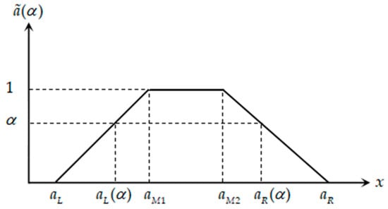 where and represent the lower and upper bounds of for the α-cut, respectively. The trapezoidal fuzzy number and its α-cuts are illustrated in Figure 2.