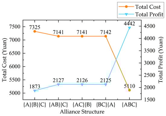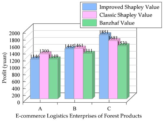 From Table 8, it can be seen that the final profit lower bounds of e-commerce logistics Enterprises A, B, and C under the Banzhaf value profit allocation scheme are CNY 1149, CNY 1311, and CNY 1530, respectively, with a total profit of CNY 3990. However, this cannot fully distribute the cooperative profit of CNY 4442, which fails to meet the efficiency of cooperative game; however, under the improved Shapley value profit allocation scheme, the final profit lower bounds of e-commerce logistics Enterprises A, B, and C are CNY 1146, CNY 1445 and CNY 1851, respectively, which can fully distribute the cooperative profit of CNY 4442, meeting cooperative game efficiency and better reflecting the actual profit allocation of e-commerce logistics alliance of forest products.