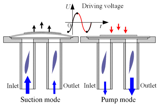 Figure 2 depicts the working principle schematic of the valveless piezoelectric pump with airfoil baffles. The piezoelectric vibrator, excited by an alternating voltage, vibrates, causing periodic changes in the volume of the pump chamber. When the volume of the pump chamber increases, the pressure within the chamber decreases, and external fluid, under the influence of a pressure differential, flows into the pump chamber through the inlet and outlet tubes. This phase is known as the suction mode of the piezoelectric pump. Conversely, when the volume of the pump chamber decreases, the pressure within the chamber rises, and the fluid, again under the influence of a pressure differential, flows out of the pump chamber through the inlet and outlet tubes. This phase is referred to as the pumping mode of the piezoelectric pump. According to Ref. [21], the fluid encounters less resistance when flowing from the leading edge to the trailing edge of the airfoil baffle (forward flow) compared to when it flows from the trailing edge to the leading edge (reverse flow), where the resistance is greater than that of the forward flow. Due to the unequal flow resistance generated by the fluid flowing over the airfoil baffle in both directions, the flow rates into and out of the inlet and outlet tubes during the suction and pumping processes of the piezoelectric pump are unequal. The arrow width marked in the inlet and outlet tube in Figure 2 represents the flow size. Thus, with the vibration of the piezoelectric vibrator, the pump can macroscopically produce a unidirectional pulsating output.