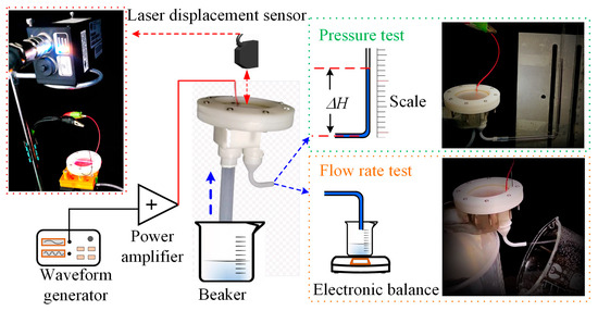 The schematic diagram of the output performance test for the valveless piezoelectric pump with airfoil baffles is depicted in Figure 3. A signal generator (AFG 3022B, Tektronix Beaverton, OR, USA) and power amplifier (HVP-300D, NJFN, Nanjing, China) provide a driving voltage of 100 V to excite the piezoelectric vibrator. The parameters of the piezoelectric vibrators are shown in Table 2 [26]. Starting from 0° angle of attack, inlet and outlet pipes with airfoil baffles of the same angle are selected to assemble a valveless piezoelectric pump for multiple experiments. Subsequently, the driving frequency is adjusted to obtain different working frequency intervals between different experimental groups. Experiments are conducted within respective working ranges, each with a variation of 1 Hz. Utilizing an analytical balance with a precision of 0.001 g [27], the mass of liquid output by the valveless pump per unit time is measured to obtain the relationship curve between the output flow rate and driving frequency at zero back pressure for the valveless piezoelectric pump with airfoil baffles. During the flow rate test, a laser displacement sensor (LK-G35, Keyence, Osaka, Japan) is employed to measure the displacement of the center point of the circular vibrator. The test results are used to set the boundary conditions for the flow field simulation. A straight pipe is connected at the outlet of the piezoelectric pump, and the height difference in the liquid level at the inlet and outlet is recorded under different driving frequencies to obtain the relationship curve between the output back pressure at zero flow rate and the frequency for the valveless piezoelectric pump.