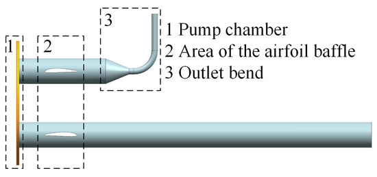 To establish different models of valveless piezoelectric pumps with airfoil baffles, four angles of attack were chosen for the Clark Y airfoil: 0°, 5°, 10°, and 15°. Continuing to increase the angle of attack of the airfoil leads to an enlargement of the diameter of the inlet and outlet tubes, thereby increasing the pump chamber diameter. Considering the dimensions of the piezoelectric vibrator used in the experiment, this study sets the maximum angle of attack of the airfoil at 15°. Simulations of the transient flow field in piezoelectric pumps were performed utilizing the CFX software, with calculations of entropy generation carried out for three distinct areas: (1) the pump chamber, (2) the airfoil baffle region, and (3) the outlet bend, as illustrated in Figure 4. The maximum displacement data obtained from a laser displacement sensor for a circular piezoelectric vibrator were configured as the motion parameter for the vibration on the upper surface of the pump chamber, with the optimal output frequency corresponding to the vibration frequency of the upper surface of the pump chamber under the given airfoil angle condition, with the inlet and outlet set to atmospheric pressure and the no-slip condition applied to the walls of the computational domain. The fluid was assumed to be incompressible, and the SIMPLE algorithm was employed to obtain the velocity and pressure coupling solution. The numerical convergence residual was 10−5. The working fluid was deionized water, characterized by a density of 1000 kg/m3, and a dynamic viscosity of 1 × 10−3 Pa·s.