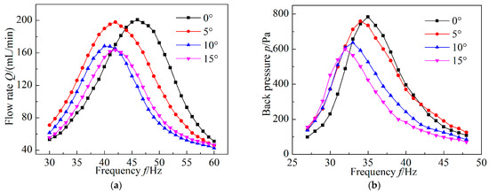 Performance curves of the valveless piezoelectric pump with airfoil baffles: (a) flow rate–frequency curve; (b) back pressure–frequency curve.