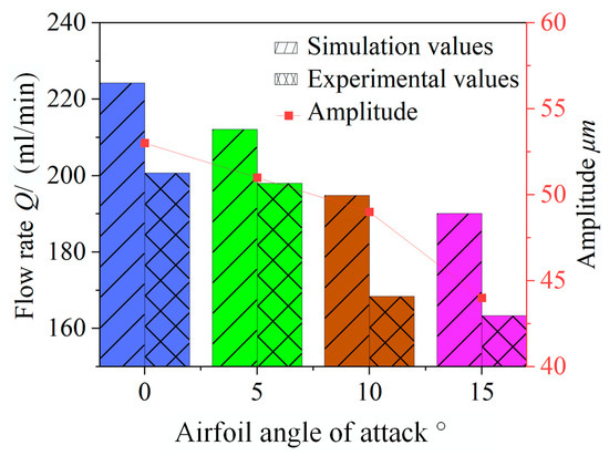 Figure 5 illustrates the experimental performance curves of the valveless piezoelectric pump with airfoil baffles at various angles of attack. Specifically, Figure 5a illustrates the relationship between flow rate and frequency for these pumps. It can be observed that the output flow rate of the pumps varies significantly with changes in the driving frequency of the piezoelectric vibrator, and this output flow rate decreases as the angle of attack of the airfoil increases. At an angle of attack of 0° for the Clark Y airfoil, the maximum output flow rate of the pump is 200.7 mL/min. At an angle of attack of 15°, the maximum output flow rate is reduced to 163.4 mL/min. Within the frequency range of 30–43 Hz, the pump with an airfoil angle of attack of 5° exhibits a higher output flow rate compared to that with an angle of attack of 0°. Figure 5b presents the back pressure–frequency curves of the piezoelectric pumps. The output back pressure of the valveless piezoelectric pumps increases and then decreases with an increase in piezoelectric vibrator driving frequency, and this maximum back pressure decreases with an increase in the airfoil angle of attack. Specifically, at an angle of attack of 0° for the Clark Y airfoil, the maximum output back pressure of the pump is 784.4 Pa, and at an angle of attack of 15°, it is reduced to 600.7 Pa. The results show that the valveless piezoelectric pump with airfoil baffles has a high output flow, so it is suitable for applications with a large flow demand. Figure 6 presents the experimental displacement values of the piezoelectric vibrator and the simulated flow rates of the pump. It can be observed that as the angle of attack of the airfoil increases, the maximum amplitude of the vibrator decreases. At an angle of attack of 0°, the central maximum amplitude of the piezoelectric vibrator reaches 53 μm. When the airfoil angle of attack is 15°, the maximum error between the simulated and experimental flow rates of the piezoelectric pump is 14%. This discrepancy arises from the use of the maximum amplitude at the center point of the piezoelectric vibrator as the displacement load in the flow field simulation, which consequently results in the simulated values being slightly higher than the experimental values.