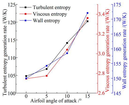 Figure 7 presents the entropy production curves of valveless piezoelectric pumps with airfoil baffles at various angles of attack. The results indicate that as the angle of attack of the airfoil increases, the entropy production within the piezoelectric pump also gradually increases, with turbulence dissipation entropy production and wall entropy production constituting a larger proportion compared to viscous entropy production.