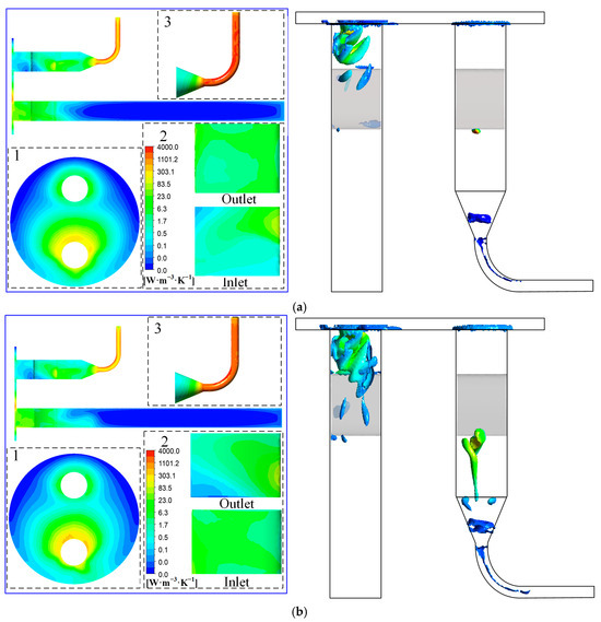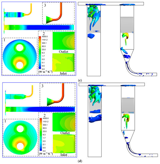 Turbulent entropy production (left) and vortex distribution (right) of the pump at different angles of attack: (a) 0°; (b) 5°; (c) 10°; and (d) 15°.